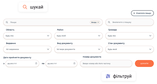 - Документи сортуються автоматично за датою, типом, органом та іншими метаданими